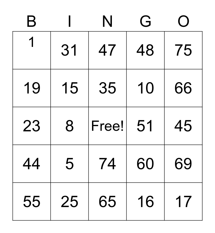 This bingo card has a free space and 24 words: 5, 25, 35, 55, 75, 1, 19, 31, 51, 74, 10, 23, 60, 69, 15, 16, 45, 47, 66, 8, 17, 44, 48 and 65.