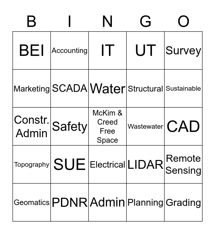 This bingo card has a free space and 24 words: SUE, PDNR, Water, Geomatics, Survey, BEI, Marketing, Accounting, Wastewater, Electrical, Structural, Constr. Admin, LIDAR, Remote Sensing, SCADA, Planning, CAD, IT, Sustainable, Safety, Grading, Topography, UT and Admin.