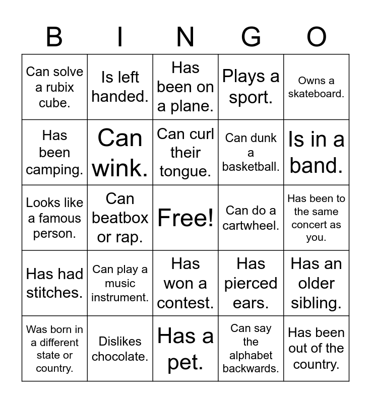 This bingo card has a free space and 46 words: Has had a broken bone., Has been out of the country., Has a younger sibling., Has a pet., Can play a music instrument., Can speak two languages., Is left handed., Was born the same month as you., Has been camping., Can whistle., Can wink., Plays a sport., Has an older sibling., Has pierced ears., Has dyed their hair., Has been on a rollercoaster., Can curl their tongue., Can do a cartwheel., Has been on a boat, Owns a skateboard., Can beatbox or rap., Can say the alphabet backwards., Can solve a rubix cube., Can dunk a basketball., Can juggle., Is in a band., Was born in a different state or country., Walks to school., Has won a contest., Has had stitches., Is an only child., Can run backwards., Is taller than you., Is shorter than you., Does volunteer work., Dislikes chocolate., Has been to the same concert as you., Baracks for the same sports team as you., Has blue eyes., Has green eyes., Has brown eyes., Has been on a plane., Looks like a famous person., Can ride a bike., Wears glasses. and Has been to the movies..