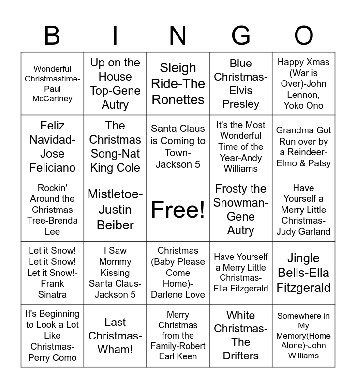 This bingo card has a free space and 40 words: All I Want for Christmas is You-Mariah Carey, Rockin' Around the Christmas Tree-Brenda Lee, Jingle Bell Rock-Bobby Helms, The Christmas Song-Nat King Cole, Last Christmas-Wham!, Christmas (Baby Please Come Home)-Darlene Love, Santa Claus is Coming to Town-Jackson 5, Santa Baby-Eartha Kitt, Happy Xmas (War is Over)-John Lennon, Yoko Ono, Let it Snow! Let it Snow! Let it Snow!-Frank Sinatra, Mistletoe-Justin Beiber, Blue Christmas-Elvis Presley, Somewhere in My Memory(Home Alone)-John Williams, Have Yourself a Merry Little Christmas-Judy Garland, Frosty the Snowman-Gene Autry, I Saw Mommy Kissing Santa Claus-Jackson 5, Christmas in Hollis-Run DMC, Wonderful Christmastime-Paul McCartney, Run Rudolph Run-Chuck Berry, Sleigh Ride-The Ronettes, Jingle Bells-Ella Fitzgerald, White Christmas-The Drifters, It's the Most Wonderful Time of the Year-Andy Williams, Feliz Navidad-Jose Feliciano, Little Saint Nick-The Beach Boys, Winter Wonderland-Dean Martin, A Holly Jolly Christmas - Burl Ives, What Christmas Means To Me-Stevie Wonder, You're a Mean One, Mr Grinch-Thurl Ravenscroft, Rudolph the Red Nosed Reindeer-Gene Autry, Baby, It's Cold Outside-Dinah Shore, Buddy Clark, It's Beginning to Look a Lot Like Christmas-Perry Como, Here Comes Santa Claus-Gene Autry, Have Yourself a Merry Little Christmas-Ella Fitzgerald, Grandma Got Run over by a Reindeer-Elmo & Patsy, Merry Christmas from the Family-Robert Earl Keen, Mele Kalikimaka-Bing Crosby, Christmas Vacation-Dominik Hauser, Katie Campbell, Up on the House Top-Gene Autry and Please Come Home for Christmas-the Eagles.