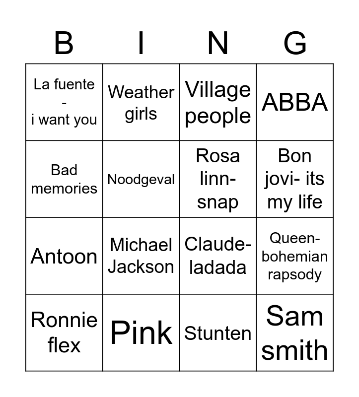 This bingo card has 20 words: Queen- bohemian rapsody, Zwemmen in Bacardi Lemon, Village people, Purple rain, Ronnie flex, Bad memories, Pink, La fuente - i want you, Antoon, Weather girls, Michael Jackson, Claude- ladada, Noodgeval, Sam smith, Rosa linn- snap, Snelle, Bon jovi- its my life, ABBA, Stunten and Wednesday.