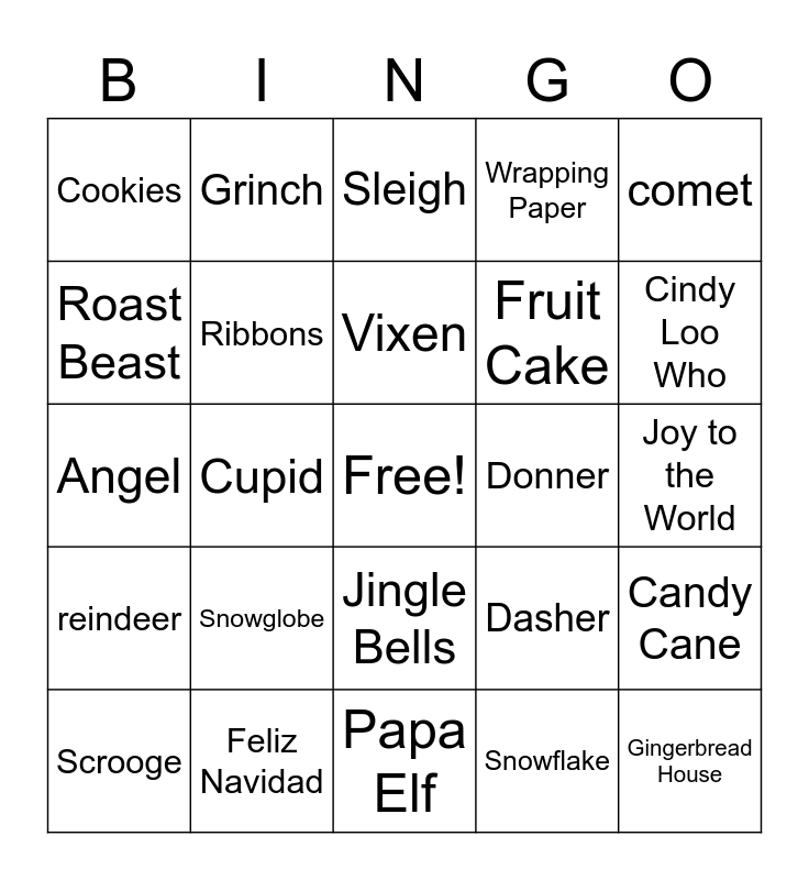 This bingo card has a free space and 47 words: Hot Cocoa, Gingerbread House, Mr. Narwhal, Papa Elf, Snowglobe, Griswold Family Christmas, Grinch, Chestnuts, Roast Beast, Max the Dog, Ribbons, Wrapping Paper, Candy Cane, Dasher, Dancer, Prancer, Vixen, Donner, Blitzen, comet, Cupid, Snowflake, Cookies, Fruit Cake, Eggnog, Cindy Loo Who, Scrooge, Its a Wonderful Life, Jingle Bells, reindeer, Stockings, Fireplace, Pine Tree, Wreath, Mele Kalikimaka, Feliz Navidad, Joy to the World, Presents, Mistletoe, SugerPlum, Nutcracker, Sleigh, Angel, Peppermint, Caroling, Chimney and Ornaments.