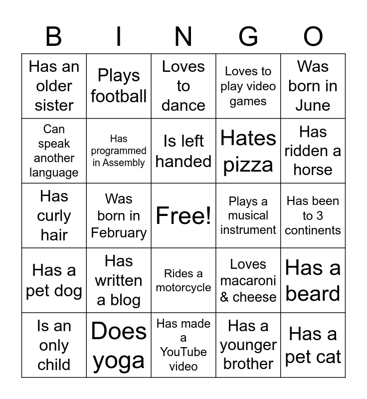 This bingo card has a free space and 26 words: Rides a motorcycle, Has a younger brother, Is left handed, Does yoga, Was born in June, Has an older sister, Can speak another language, Plays football, Has been to 3 continents, Loves macaroni & cheese, Hates pizza, Has curly hair, Has a beard, Is an only child, Was born in February, Never been on an airplane, Loves to play video games, Has a pet dog, Loves to dance, Has a pet cat, Has ridden a horse, Has made a YouTube video, Plays a musical instrument, Has written a blog, Has programmed in Assembly and Has participated in Security Hackaton.