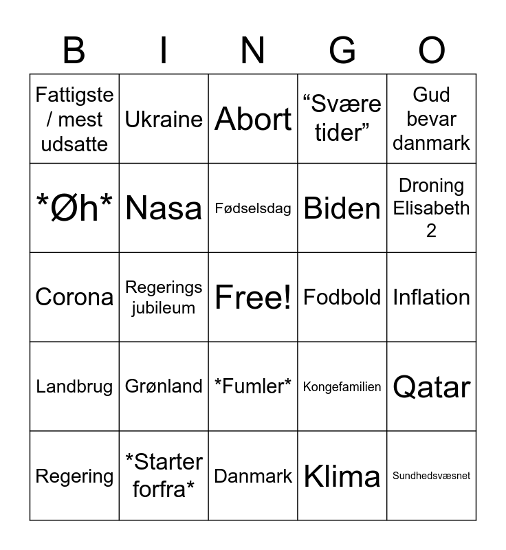 This bingo card has a free space and 25 words: Grønland, Danmark, Fødselsdag, Regering, Gud bevar danmark, Fattigste / mest udsatte, *Øh*, Ukraine, Fodbold, *Fumler*, Biden, Corona, Kongefamilien, Qatar, Nasa, Flytninge, Inflation, Abort, Droning Elisabeth 2, Regerings jubileum, Sundhedsvæsnet, *Starter forfra*, Landbrug, “Svære tider” and Klima.