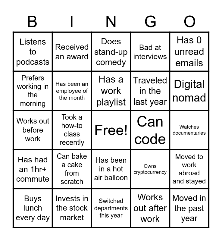 This bingo card has a free space and 65 words: Prefers remote work, Prefers working in office, Has a snack stash, Moved to work abroad and stayed, Drinks 3+ cups coffee a day, Has worked in various industries, Received an award, Has performed in public, Has a work playlist, Has a favorite pen, Has been in a hot air balloon, Has a messy desk, Watches documentaries, Has 0 unread emails, Was in a wedding party this year, Prefers working in the morning, Took a how-to class recently, Listens to podcasts, Prefers working at night, Traveled in the last year, Can bake a cake from scratch, Has had an 1hr+ commute, Bad at interviews, Manager, Bikes to work, Reads newspapers, Carpools, Runs errands during lunch break, Moved in the past year, Buys coffee every morning, Buys lunch every day, Collects something, Goes all-out on holiday decorating, Played a prank on a coworker, Owns cryptocurrency, Invests in the stock market, Climbed a mountain, Works out before work, Works out after work, Has taken the kid to work, Has been an employee of the month, Speaks 2+ languages, Can code, Received a gift from a client, Mentioned by name in a good review, Mentor, Digital nomad, Attends networking events, Part of a professional group, Likes a pizza with pineapple, Going on vacation soon, Was promoted this year, Has taken a cruise, Switched departments this year, Good at interviews, Worked at a family business, Visited 4+ continents, Does stand-up comedy, Led a project, Planned a work party, Founded a start-up, Moved to work abroad and came back, Built an app, Regularly writes online reviews and CEO.