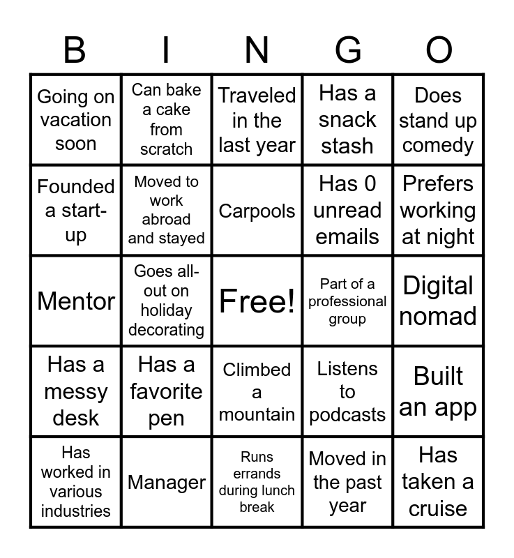 This bingo card has a free space and 65 words: Attends networking events, Bad at interviews, Bikes to work, Built an app, Buys coffee every morning, Buys lunch every day, Can bake a cake from scratch, Can code, Carpools, CEO, Climbed a mountain, Collects something, Digital nomad, Does stand up comedy, Drinks 3+ cups coffee a day, Founded a start-up, Goes all-out on holiday decorating, Going on vacation soon, Good at interviews, Has 0 unread emails, Has a favorite pen, Has a messy desk, Has a snack stash, Has a work playlist, Has been an employee of the month, Has been in a hot air balloon, Has had an 1hr+ commute, Has performed in public, Has taken a cruise, Has taken the kid to work, Has worked in various industries, Invests in the stock market, Led a project, Likes a pizza with pineapple, Listens to podcasts, Manager, Mentioned by name in a good review, Mentor, Moved in the past year, Moved to work abroad and came back, Moved to work abroad and stayed, Owns cryptocurrency, Part of a professional group, Planned a work party, Played a prank on a coworker, Prefers remote work, Prefers working at night, Prefers working in office, Prefers working in the morning, Reads newspapers, Received a gift from a client, Received an award, Regularly writes online reviews, Runs errands during lunch break, Speaks 2+ languages, Switched departments this year, Took a how-to class recently, Traveled in the last year, Visited 4+ continents, Was in a wedding party this year, Was promoted this year, Watches documentaries, Worked at a family business, Works out after work and Works out before work.