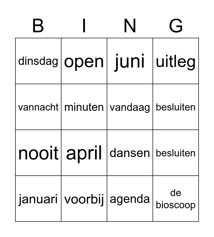 This bingo card has 20 words: besluiten, het kaartje, juni, weekend, januari, vannacht, voorbij, dinsdag, nooit, open, april, dansen, minuten, de bioscoop, vandaag, de verjaardag, besluiten, uitleg, agenda and het begin.