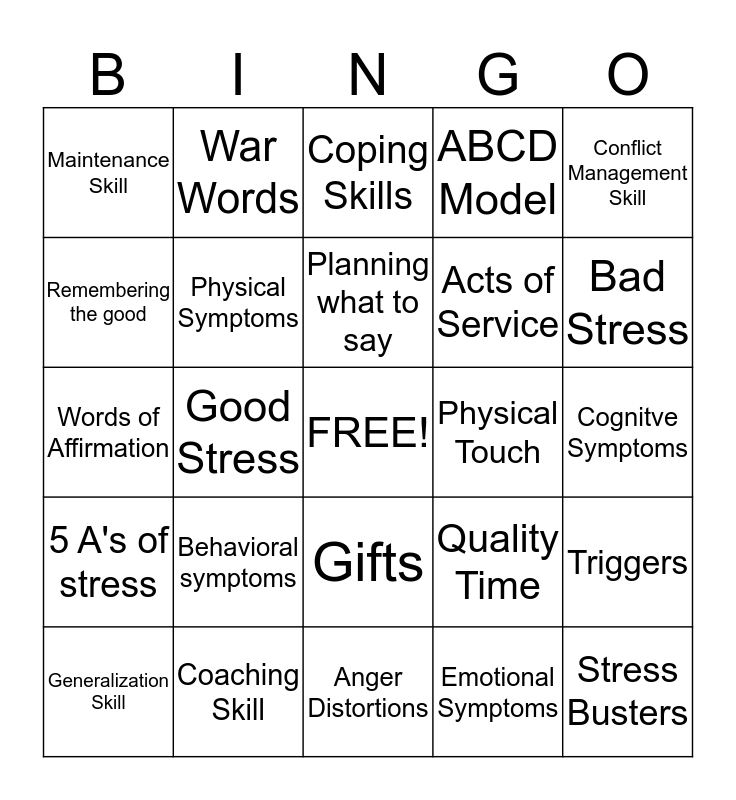 This bingo card has a free space and 24 words: Behavioral symptoms, Coaching Skill, Planning what to say, Generalization Skill, Conflict Management Skill, Maintenance Skill, Remembering the good, War Words, Physical Touch, Gifts, Acts of Service, Words of Affirmation, Quality Time, Triggers, Physical Symptoms, Emotional Symptoms, Cognitve Symptoms, Coping Skills, Bad Stress, Good Stress, Stress Busters, 5 A's of stress, ABCD Model and Anger Distortions.