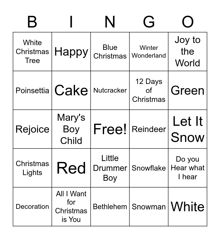 This bingo card has a free space and 70 words: Jingle Bell Rock, Let It Snow, Feliz Navidad, Last Christmas, All I Want for Christmas is You, Santa Baby, Winter Wonderland, Deck The Halls, Joy to the World, Santa Claus is Coming to Town, Do you Hear what I hear, I saw Mommy Kissing Santa Claus, White Christmas Tree, Blue Christmas, Frosty the Snowman, Mary's Boy Child, Little Drummer Boy, 12 Days of Christmas, Driving Home for Christmas, Christmas Lights, Reindeer, Snowflake, Green, Gold, Bells, Carol, Star, holiday, Snowman, Santa Claus, Happy, Ornament, Christmas Tree, Jolly, Party, Blessing, Christmas Card, Family, Church, Poinsettia, Mistletoe, Red, White, Silent Night, December, Cake, Decoration, Games, Ham, Joy, Love, Music, Magical, Miraculous, Bethlehem, Noel, Nutcracker, Tradition, Dove, Greetings, Rejoice, Socks, Snow, Silver, Three Kings, Vixen, Vacation, Winter, Merry and Thanksgiving.