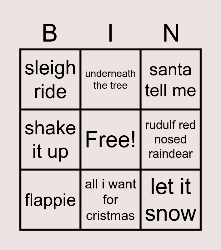 This bingo card has a free space and 9 words: flappie, all i want for cristmas, santa tell me, sleigh ride, underneath the tree, rudulf red nosed raindear, shake it up, Miseltoe and let it snow.