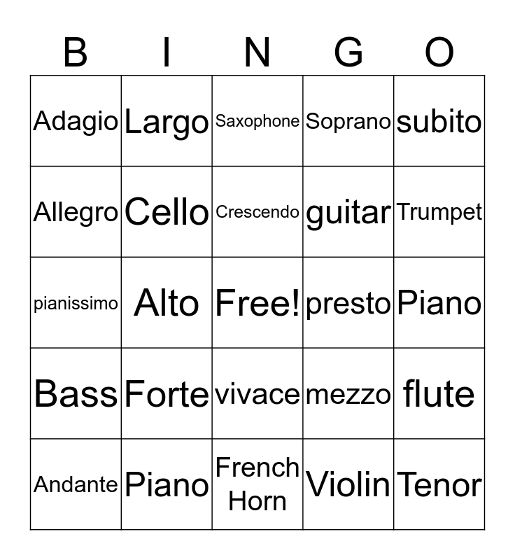 This bingo card has a free space and 24 words: Forte, Piano, Crescendo, Andante, subito, Adagio, Allegro, Largo, presto, vivace, guitar, pianissimo, mezzo, flute, Cello, Violin, Piano, Saxophone, Trumpet, Alto, Tenor, Bass, Soprano and French Horn.