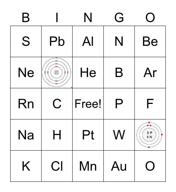 This bingo card has 5 images, a free space and 33 words: H, He, Li, Be, B, C, N, O, F, Ne, Na, Mg, Al, Si, P, S, Cl, Ar, K, Ca, Mn, Fe, Br, Kr, Ag, I, Pt, Au, Pb, U, W, Rn and Ra.