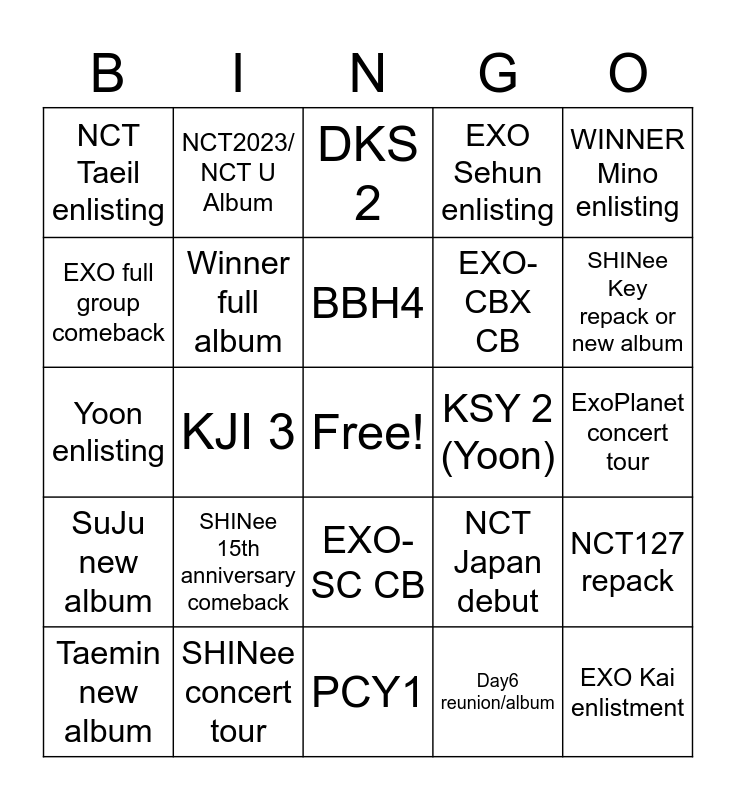 This bingo card has a free space and 24 words: SHINee 15th anniversary comeback, SHINee concert tour, BBH4, Taemin new album, WINNER Mino enlisting, NCT Taeil enlisting, EXO full group comeback, NCT2023/ NCT U Album, KSY 2 (Yoon), EXO-SC CB, EXO-CBX CB, Yoon enlisting, NCT Japan debut, NCT127 repack, Winner full album, Day6 reunion/album, ExoPlanet concert tour, DKS 2, SHINee Key repack or new album, KJI 3, EXO Kai enlistment, SuJu new album, EXO Sehun enlisting and PCY1.