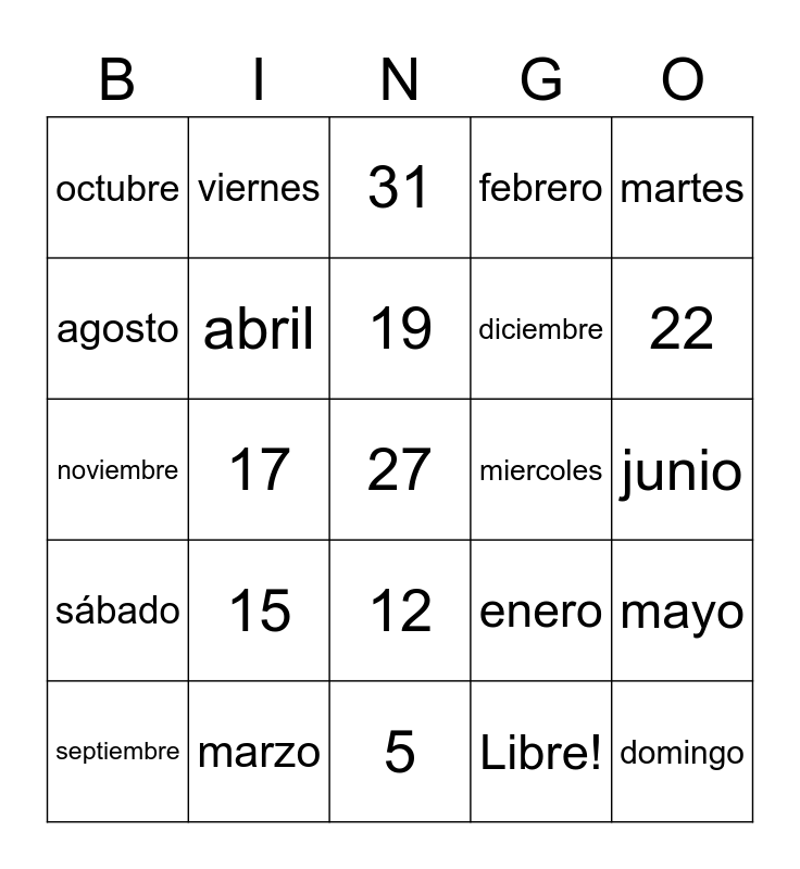 This bingo card has 30 words: marzo, viernes, 17, lunes, octubre, 31, abril, 12, miercoles, 5, junio, 27, Libre!, domingo, 22, julio, enero, sábado, 15, martes, noviembre, jueves, viernes, diciembre, agosto, febrero, mayo, septiembre, 19 and 8.