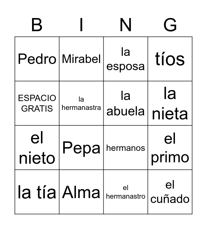 This bingo card has 37 words: la madre, el padre, el abuelo, la abuela, el sobrino, la sobrina, la nieta, el nieto, ESPACIO GRATIS, la prima, el primo, tíos, la tía, el hermanastro, la hermanastra, el cuñado, la cuñada, la esposa, el esposo, Alma, Pedro, Pepa, Felix, Bruno, Julieta, Agustin, Mirabel, Luisa, Isabela, Dolores, Camilo, Antonio, hermanos, la hermana, la hija, el nieto and la prima.