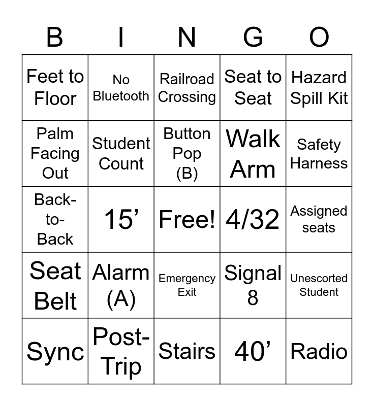 This bingo card has a free space and 44 words: First Aid Kit, Radio, Pre-trip, Sync, Talk Quietly, 40’, Railroad Crossing, Handrail, Hazard Spill Kit, Post-Trip, Seat to Seat, 4/32, Emergency Exit, Alarm (A), Walk, Stairs, Aisle, Back-to-Back, Emergency Triangles, Safety Harness, No Bluetooth, L.R.E., Talk Quietly, Feet to Floor, 10 giant steps, Assigned seats, 16,000 pounds, Channel 1, Signal 8, Seat Belt, Stop, Unescorted Student, Increase Following Distance, School Bus Driver, 15’, Leaks (L), 12’-15’, Hand-Signals, Button Pop (B), Palm Facing Out, Walk Arm, Student, Student Count and Integrated Seat.