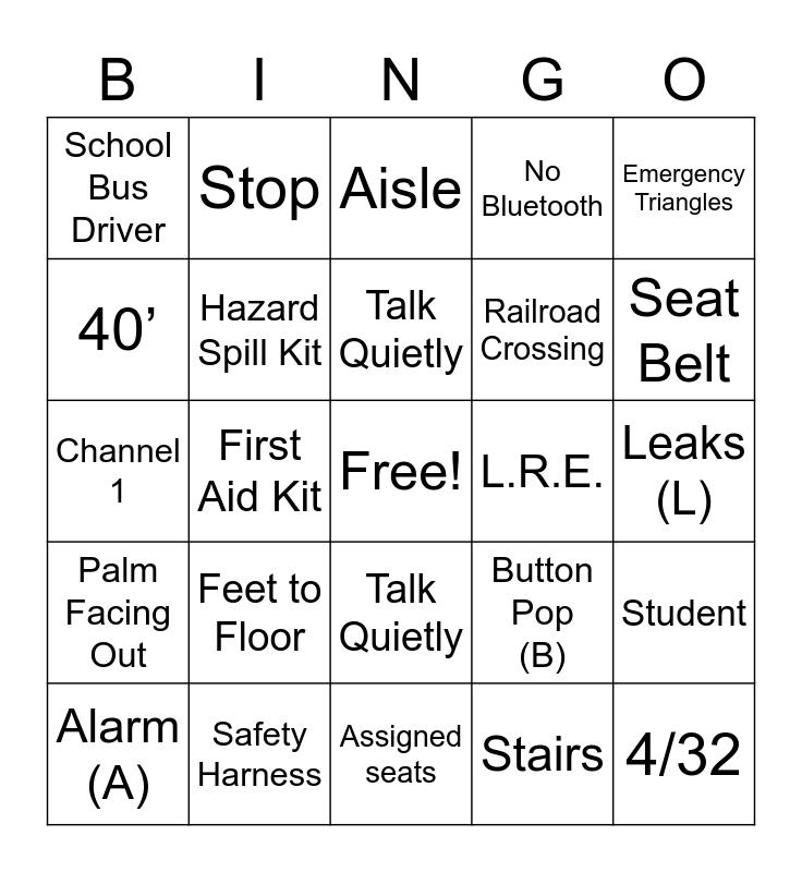 This bingo card has a free space and 44 words: Seat to Seat, 4/32, Emergency Exit, Alarm (A), Walk, Stairs, Aisle, Back-to-Back, Emergency Triangles, Safety Harness, No Bluetooth, L.R.E., Talk Quietly, Feet to Floor, 10 giant steps, Assigned seats, 16,000 pounds, Channel 1, Signal 8, Seat Belt, Stop, Unescorted Student, Increase Following Distance, School Bus Driver, 15’, Leaks (L), 12’-15’, Hand-Signals, Button Pop (B), Palm Facing Out, Walk Arm, Student, Student Count, Integrated Seat, First Aid Kit, Radio, Pre-trip, Sync, Talk Quietly, 40’, Railroad Crossing, Handrail, Hazard Spill Kit and Post-Trip.