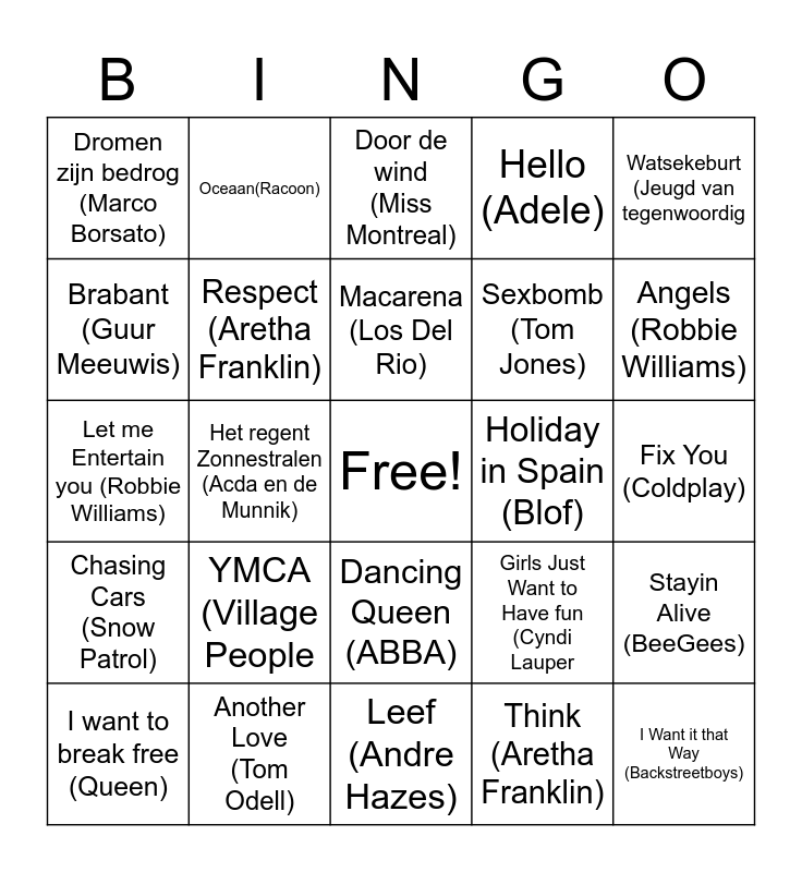 This bingo card has a free space and 25 words: YMCA (Village People, Leef (Andre Hazes), Macarena (Los Del Rio), I want to break free (Queen), Watsekeburt (Jeugd van tegenwoordig, Dromen zijn bedrog (Marco Borsato), Brabant (Guur Meeuwis), Oceaan(Racoon), Holiday in Spain (Blof), Dancing Queen (ABBA), Sexbomb (Tom Jones), Let me Entertain you (Robbie Williams), Girls Just Want to Have fun (Cyndi Lauper, Stayin Alive (BeeGees), Respect (Aretha Franklin), The Motto (Tiesto), Fix You (Coldplay), Door de wind (Miss Montreal), Angels (Robbie Williams), Het regent Zonnestralen (Acda en de Munnik), I Want it that Way (Backstreetboys), Another Love (Tom Odell), Chasing Cars (Snow Patrol), Hello (Adele) and Think (Aretha Franklin).