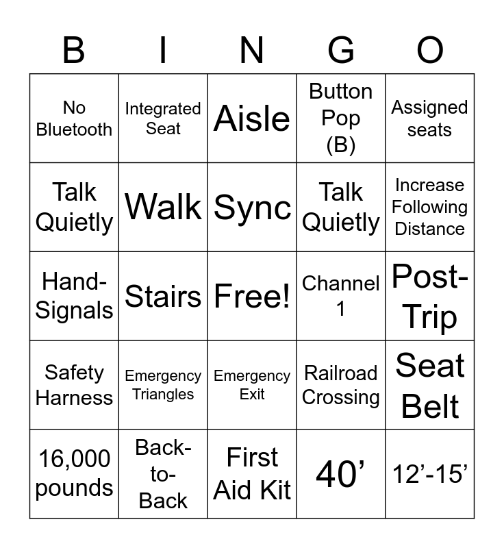 This bingo card has a free space and 44 words: 10 giant steps, 12’-15’, 15’, 16,000 pounds, 4/32, 40’, Aisle, Alarm (A), Assigned seats, Back-to-Back, Button Pop (B), Channel 1, Emergency Exit, Emergency Triangles, Feet to Floor, First Aid Kit, Handrail, Hand-Signals, Hazard Spill Kit, Increase Following Distance, Integrated Seat, L.R.E., Leaks (L), No Bluetooth, Palm Facing Out, Post-Trip, Pre-trip, Radio, Railroad Crossing, Safety Harness, School Bus Driver, Seat Belt, Seat to Seat, Signal 8, Stairs, Stop, Student, Student Count, Sync, Talk Quietly, Talk Quietly, Unescorted Student, Walk and Walk Arm.