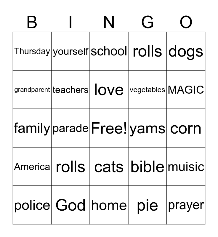 This bingo card has a free space and 24 words: rolls, God, love, police, dogs, Thursday, grandparent, yourself, yams, cats, vegetables, family, bible, muisic, teachers, pie, corn, school, MAGIC, parade, prayer, America, rolls and home.