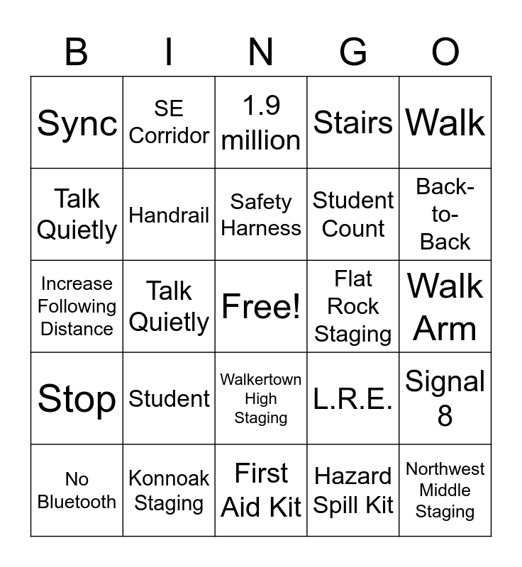 This bingo card has a free space and 66 words: Specialty Corridor, South Main Street Staging, South Lot Staging, Signal 8, Seat to Seat, Seat Belt, SE Corridor, School Bus Driver, Safety Harness, Railroad Crossing, Walkertown High Staging, Walkertown Elementary Staging, Walk Arm, Walk, Unescorted Student, Talk Quietly, Talk Quietly, Sync, SW Corridor, Student Count, Student, Stop, Stairs, Radio, Pre-trip, Post-Trip, Palm Facing Out, NW Corridor, Northwest Middle Staging, North Forsyth High School Staging, No Bluetooth, NE Corridor, Meadowlark staging, Leaks (L), L.R.E., Konnoak Staging, Integrated Seat, Increase Following Distance, Hazard Spill Kit, Hand-Signals, Handrail, Green Bars, Flat Rock Staging, Chief Mechanic, Channel 1, Button Pop (B), Back-to-Back, Assistant Director, Assigned seats, Alarm (A), Aisle, 60 to 100 gallons, 40’, 4/32, 16,000 pounds, 15’, 12’-15’, 10 giant steps, 1.9 million, First Aid Kit, Feet to Floor, Emergency Triangles, Emergency Exit, East Forsyth Middle Staging, Director and Diesel Fuel.
