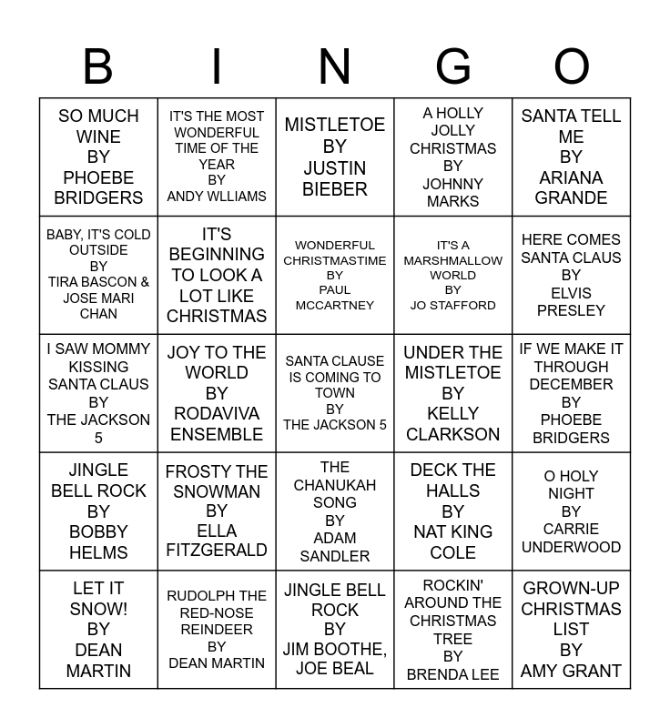 This bingo card has a free space and 34 words: ALL I WANT FOR CHRISTMAS IF YOU BY MARIAH CAREY, ROCKIN' AROUND THE CHRISTMAS TREE BY BRENDA LEE, 2000 MILES BY THE PRETENDERS, LAST CHRISTMAS BY WHAM!, JINGLE BELL ROCK BY BOBBY HELMS, IT'S BEGINNING TO LOOK A LOT LIKE CHRISTMAS, SANTA TELL ME BY ARIANA GRANDE, LET IT SNOW! BY DEAN MARTIN, IT'S THE MOST WONDERFUL TIME OF THE YEAR BY ANDY WLLIAMS, UNDERNEATH THE TREE BY KELLY CLARKSON, WONDERFUL CHRISTMASTIME BY PAUL MCCARTNEY, MISTLETOE BY JUSTIN BIEBER, HAVE YOURSELF A MERRY LITTLE CHRISTMAS BY SAM SMITH, WHITE CHRISTMAS BY TESS HENLEY, UNDER THE MISTLETOE BY KELLY CLARKSON, HERE COMES SANTA CLAUS BY ELVIS PRESLEY, RUDOLPH THE RED-NOSE REINDEER BY DEAN MARTIN, I SAW MOMMY KISSING SANTA CLAUS BY THE JACKSON 5, FROSTY THE SNOWMAN BY ELLA FITZGERALD, DECK THE HALLS BY NAT KING COLE, THE CHANUKAH SONG BY ADAM SANDLER, DREIDEL BY ERRAN BARON COHEN FEAT. JULES BROOKES, SO MUCH WINE BY PHOEBE BRIDGERS, IF WE MAKE IT THROUGH DECEMBER BY PHOEBE BRIDGERS, JINGLE BELL ROCK BY JIM BOOTHE, JOE BEAL, GROWN-UP CHRISTMAS LIST BY AMY GRANT, A HOLLY JOLLY CHRISTMAS BY JOHNNY MARKS, SANTA BABY BY JOAN JAVITS, IT'S A MARSHMALLOW WORLD BY JO STAFFORD, BABY, IT'S COLD OUTSIDE BY TIRA BASCON & JOSE MARI CHAN, FELIZ NAVIDAD, JOY TO THE WORLD BY RODAVIVA ENSEMBLE, O HOLY NIGHT BY CARRIE UNDERWOOD and WINTER WONDERLAND BY BING CROSBY.