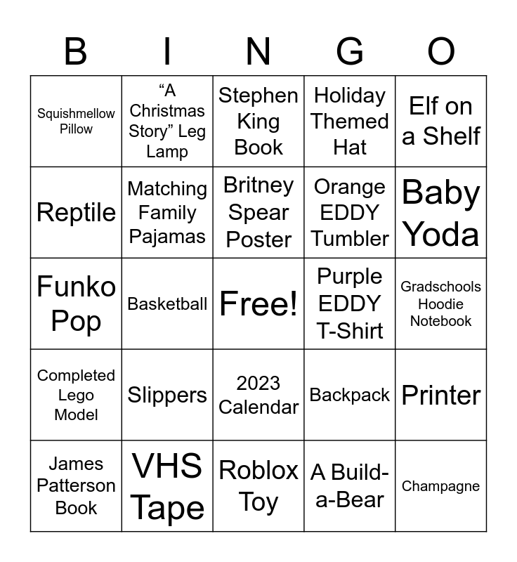 This bingo card has a free space and 100 words: New EDDY log hat, Orange EDDY Ceramic Mug, Gradschools Hoodie Notebook, Pizza Wheel Cutter, Candy Cane, Pine Scented Candle, Vanilla Cupcake Candle, Snoop on a Stoop, Holiday Ugly Sweater, Monopoly Board Game, Gingerbread House, Holiday Themed Cookies, Rubber Duck, VHS Tape, Spice Girls Album, Pez Dispenser, Orange EDDY Tumbler, Elmers Pink Sparkle Glue, Remote Control, Google Notebook, EDDY Pen, Mint Green EDDY Crew Neck Sweater, Salmon EDDY Summer Outing V-Neck shirt, Wine Glass, Baseball Cap, Purple EDDY T-Shirt, Elf on a Shelf, Backpack, House Plant, Kettle, Basketball, Squishmellow Pillow, Pool Cue, Pokémon Card, A Build-a-Bear, Britney Spear Poster, Printer, Air Fryer, SmartWatch, Amazon Alexa, Meat Thermometer, Nintendo Switch, Funko Pop, Garden Gnome, Baby Yoda, Stephen King Book, Cookbook, Beanie Baby, Barbie, Roblox Toy, Pop Fidget toy, Himalayan Yak Chew, Himalayan Salt Lamp, Video Game Controller, Furby, Wooden Spoon, Mini Terrarium, Matching Winter Hat and Gloves, Eggnog, Holiday Themed Hat, Cordless Drill, Physical Target Gift Card, Jigsaw Puzzle, Fuzzy Socks, Starbucks Cup, Hershey’s Bar, Yeti Tumbler, Tennis Ball, Ramen Bowl, Instant Ramen, Kraft Mac & Cheese, Slippers, Wooden Cutting Board, Fresh Floral Arrangement, Dog Toy, Cat Toy, Catnip, Reptile, Billiard Ball, Waffle Iron, Cookie Jar, Champagne, Unicorn Plush Toy, 2023 Calendar, Whoopie Cushion, “A Christmas Story” Leg Lamp, Spam in a can, Pork Roll, Model Car, Completed Lego Model, Nintendo 64 Game or Console, Wrapped Present, Blackberry Cell Phone, James Patterson Book, Matching Family Pajamas, Amazon Box, Postcard, Stamp, Silver Dollar Coin and Ben & Jerry’s Ice Cream.