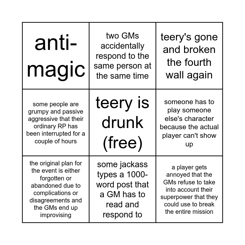 This bingo card has a free space and 8 words: someone has to play someone else's character because the actual player can't show up, teery's gone and broken the fourth wall again, two GMs accidentally respond to the same person at the same time, the original plan for the event is either forgotten or abandoned due to complications or disagreements and the GMs end up improvising, anti-magic, a player gets annoyed that the GMs refuse to take into account their superpower that they could use to break the entire mission, some people are grumpy and passive aggressive that their ordinary RP has been interrupted for a couple of hours and some jackass types a 1000-word post that a GM has to read and respond to.