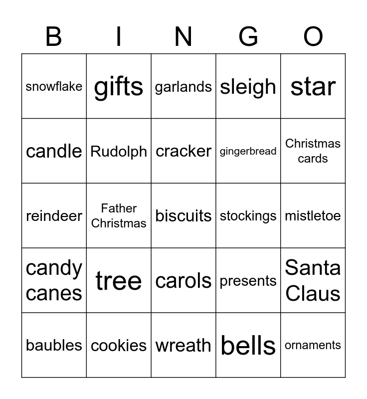 This bingo card has 25 words: tree, wreath, cracker, baubles, star, snowflake, candle, gifts, stockings, carols, gingerbread, reindeer, presents, Santa Claus, Rudolph, ornaments, mistletoe, garlands, Christmas cards, Father Christmas, biscuits, cookies, candy canes, sleigh and bells.