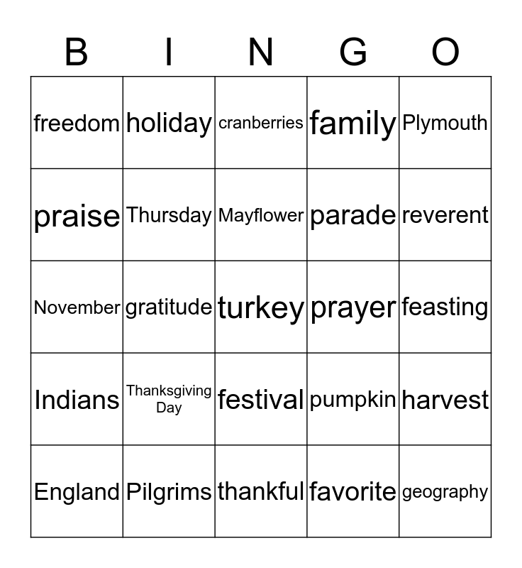This bingo card has a free space and 24 words: Thanksgiving Day, Pilgrims, Mayflower, England, Plymouth, freedom, praise, holiday, prayer, festival, parade, November, pumpkin, harvest, Thursday, favorite, feasting, cranberries, reverent, gratitude, geography, Indians, family and thankful.