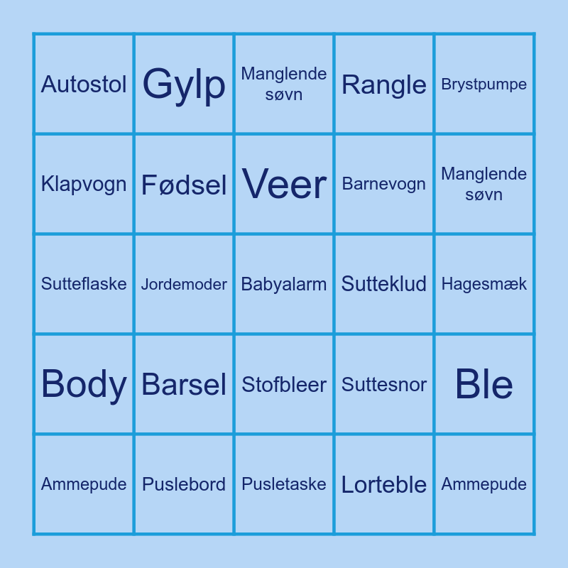 This bingo card has 28 words: Ble, Sut, Barnevogn, Lorteble, Klapvogn, Manglende søvn, Gylp, Body, Sutteklud, Ammepude, Sutteflaske, Rangle, Puslebord, Pusletaske, Manglende søvn, Ammeinndlæg, Barsel, Fødsel, Veer, Stofbleer, Autostol, Ammepude, Babyalarm, Jordemoder, Hagesmæk, Suttesnor, Brystpumpe and Blespand.