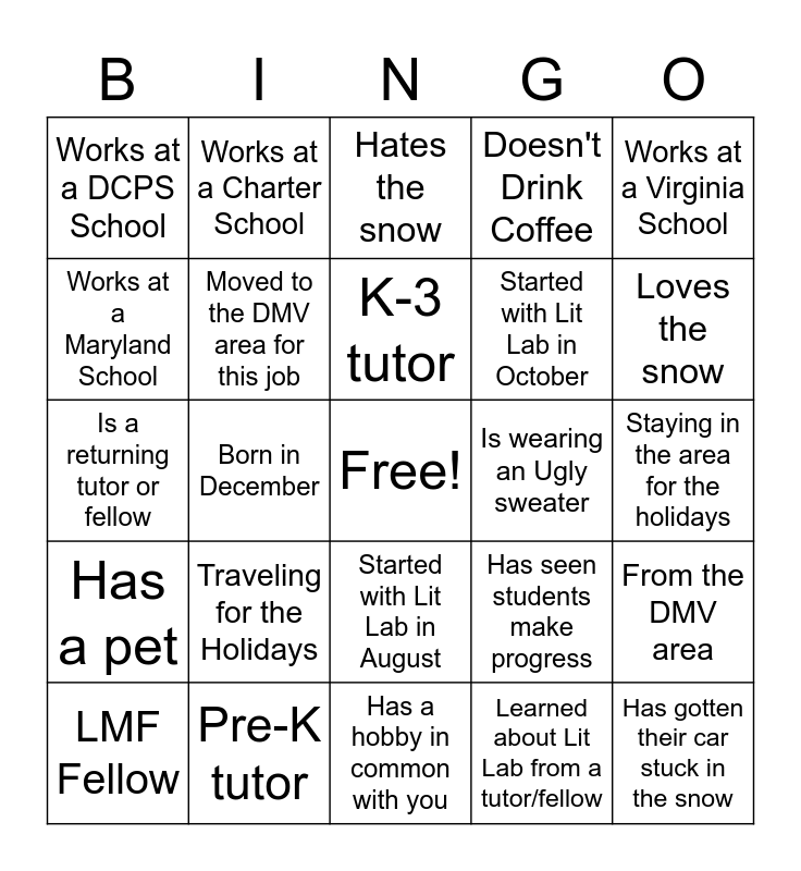 This bingo card has a free space and 24 words: Traveling for the Holidays, Pre-K tutor, K-3 tutor, LMF Fellow, Works at a Virginia School, Works at a DCPS School, Works at a Maryland School, Works at a Charter School, Is wearing an Ugly sweater, Started with Lit Lab in August, Started with Lit Lab in October, Is a returning tutor or fellow, Has seen students make progress, From the DMV area, Moved to the DMV area for this job, Learned about Lit Lab from a tutor/fellow, Staying in the area for the holidays, Hates the snow, Loves the snow, Born in December, Has gotten their car stuck in the snow, Has a pet, Doesn't Drink Coffee and Has a hobby in common with you.