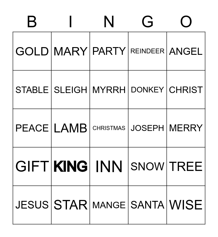 This bingo card has a free space and 24 words: KING, STAR, MYRRH, JESUS, ANGEL, GOLD, STABLE, MARY, JOSEPH, INN, DONKEY, PEACE, SNOW, TREE, SLEIGH, SANTA, MERRY, PARTY, CHRIST, LAMB, WISE, GIFT, REINDEER and MANGE.