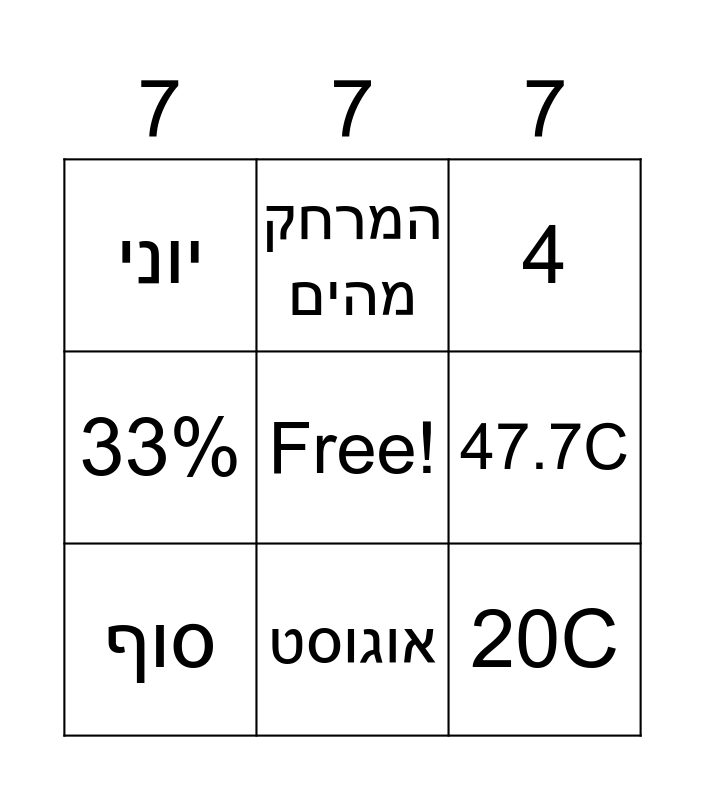 This bingo card has a free space and 15 words: 9, 3, 4, יוני, אוגוסט, 20C, 26C, 1961s, 47.7C, 29mm, 23%, 33%, סוף, המרחק מהים and השוני בטמפ.