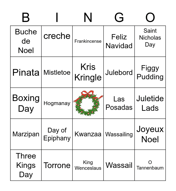 This bingo card has a free space and 24 words: Day of Epiphany, Torrone, Kris Kringle, Three Kings Day, Saint Nicholas Day, Buche de Noel, Pinata, creche, Las Posadas, Kwanzaa, Julebord, Boxing Day, Wassailing, Joyeux Noel, Mistletoe, Wassail, Juletide Lads, Frankincense, Figgy Pudding, Hogmanay, O Tannenbaum, Marzipan, Feliz Navidad and King Wenceslaus.