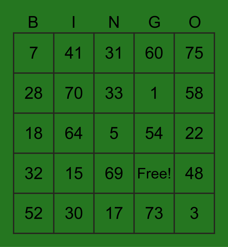 This bingo card has 25 words: 15, 17, 33, 52, 75, 7, 28, 41, 54, 69, 1, 18, Free!, 48, 70, 3, 22, 31, 58, 64, 5, 30, 32, 60 and 73.