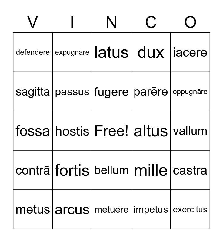 This bingo card has a free space and 24 words: metus, fortis, fugere, impetus, iacere, dēfendere, expugnāre, latus, altus, vallum, fossa, passus, mille, castra, sagitta, arcus, metuere, dux, oppugnāre, contrā, hostis, bellum, parēre and exercitus.