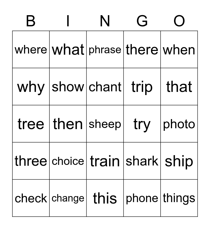 This bingo card has a free space and 24 words: choice, change, chant, check, when, where, why, what, try, train, trip, tree, shark, ship, show, phone, photo, phrase, that, then, things, three, there and this.