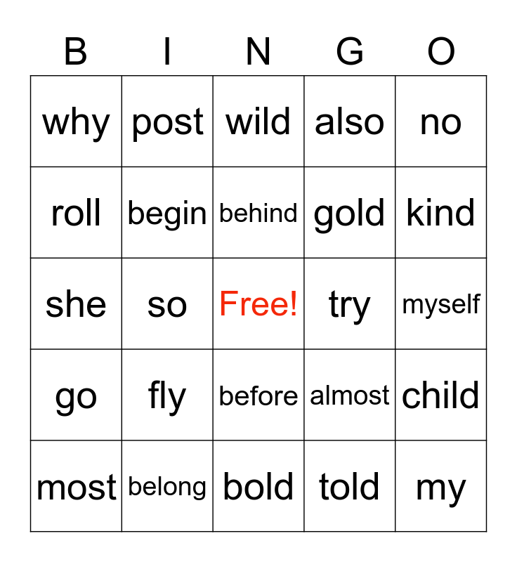 This bingo card has a free space and 41 words: he, she, me, begin, belong, before, behind, be, no, go, so, also, my, myself, try, fly, spry, why, pry, wild, child, mild, bold, gold, mold, scold, told, find, kind, mind, remind, post, most, host, almost, roll, troll, stroll, toll, unroll and unkind.