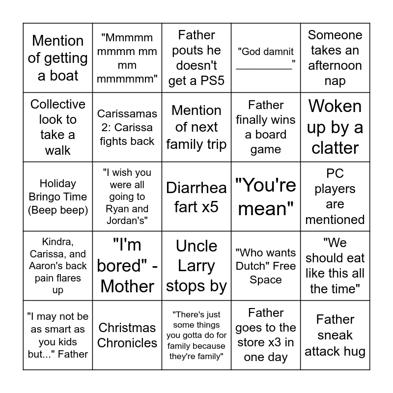 This bingo card has 25 words: "I'm bored" - Mother, "There's just some things you gotta do for family because they're family", Mention of next family trip, "I may not be as smart as you kids but..." Father, Someone takes an afternoon nap, Mention of getting a boat, Collective look to take a walk, "Mmmmm mmmm mm mm mmmmmm", "You're mean", Uncle Larry stops by, Father finally wins a board game, Holiday Bringo Time (Beep beep), "Who wants Dutch" Free Space, "We should eat like this all the time", Carissamas 2: Carissa fights back, Father sneak attack hug, PC players are mentioned, Father pouts he doesn't get a PS5, Woken up by a clatter, "I wish you were all going to Ryan and Jordan's", Diarrhea fart x5, Christmas Chronicles, Kindra, Carissa, and Aaron's back pain flares up, "God damnit __________" and Father goes to the store x3 in one day.