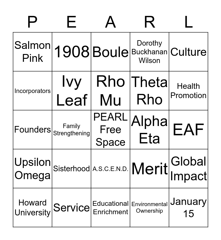 This bingo card has a free space and 28 words: Global Impact, Apple Green, Theta Rho, Environmental Ownership, Incorporators, Boule, 1908, Upsilon Omega, Alpha Eta, Howard University, Founders, Dorothy Buckhanan Wilson, Service, Educational Enrichment, Health Promotion, Ethel Hedgeman Lyle, Sisterhood, Ivy Leaf, Rho Mu, A.S.C.E.N.D., Salmon Pink, AKA, January 15, Family Strengthening, EAF, Merit, Culture and Soror.