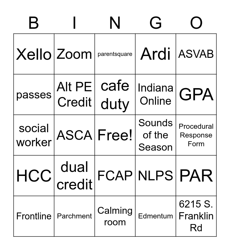 This bingo card has a free space and 24 words: dual credit, Parchment, cafe duty, Frontline, ASVAB, Xello, passes, Zoom, Sounds of the Season, FCAP, Indiana Online, social worker, NLPS, PAR, Alt PE Credit, Edmentum, Procedural Response Form, parentsquare, GPA, ASCA, 6215 S. Franklin Rd, HCC, Ardi and Calming room.