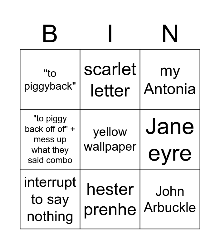 This bingo card has a free space and 8 words: Jane eyre, my Antonia, scarlet letter, interrupt to say nothing, "to piggyback", John Arbuckle, "to piggy back off of" + mess up what they said combo and hester prenhe.