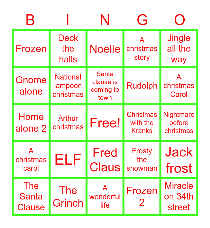 This bingo card has a free space and 24 words: ELF, The Grinch, Santa clause is coming to town, The Santa Clause, Jingle all the way, Frozen, Gnome alone, Deck the halls, Christmas with the Kranks, Fred Claus, Rudolph, Home alone 2, Frosty the snowman, Jack frost, National lampoon christmas, Frozen 2, Nightmare before christmas, Noelle, A christmas Carol, Arthur christmas, Miracle on 34th street, A christmas carol, A christmas story and A wonderful life.