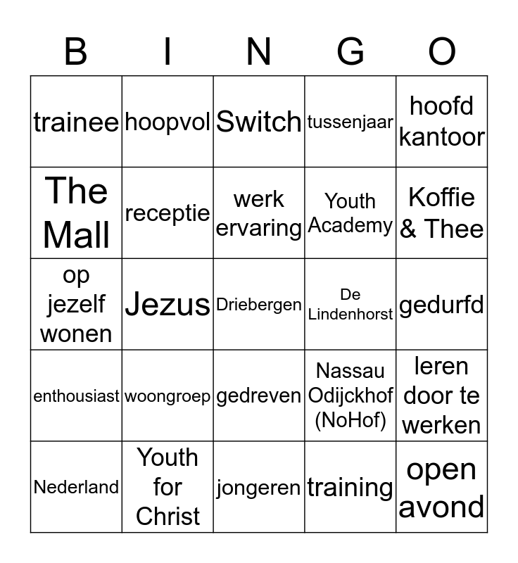 This bingo card has 25 words: woongroep, jongeren, werk ervaring, Nederland, hoofd kantoor, trainee, The Mall, hoopvol, De Lindenhorst, gedreven, Youth Academy, op jezelf wonen, Nassau Odijckhof (NoHof), leren door te werken, receptie, open avond, gedurfd, Switch, Koffie & Thee, Jezus, Driebergen, Youth for Christ, enthousiast, tussenjaar and training.