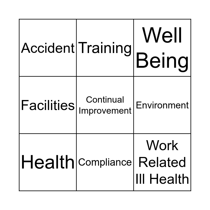 This bingo card has 9 words: Health, Well Being, Training, Facilities, Accident, Environment, Continual Improvement, Work Related Ill Health and Compliance.