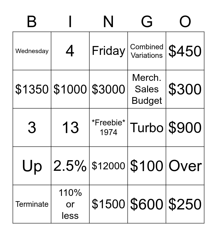 This bingo card has a free space and 24 words: 2.5%, 110% or less, $3000, Terminate, $450, Wednesday, $1350, 4, Turbo, $12000, Merch. Sales Budget, 3, $100, Over, $1000, $600, $900, Friday, $300, 13, $250, Up, Combined Variations and $1500.
