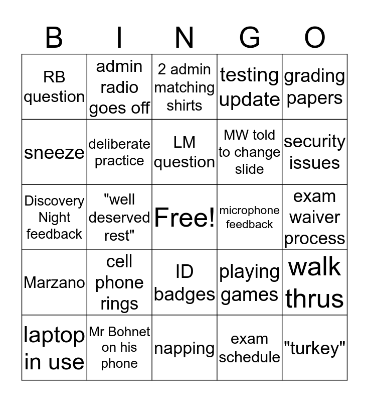This bingo card has a free space and 24 words: cell phone rings, Mr Bohnet on his phone, LM question, laptop in use, grading papers, RB question, sneeze, admin radio goes off, microphone feedback, ID badges, MW told to change slide, Discovery Night feedback, playing games, walk thrus, deliberate practice, exam schedule, exam waiver process, 2 admin matching shirts, security issues, "well deserved rest", "turkey", Marzano, testing update and napping.