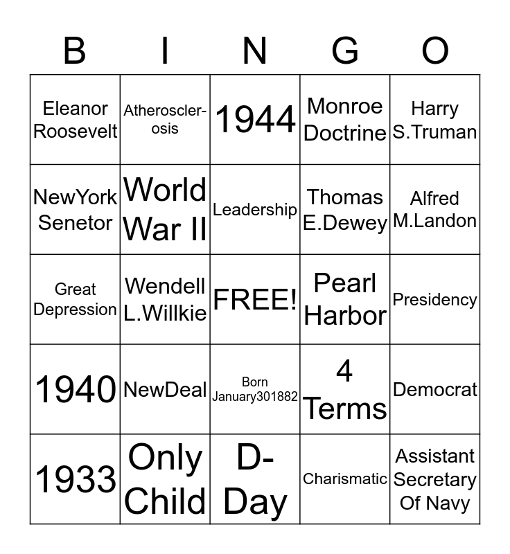 This bingo card has a free space and 24 words: NewDeal, Only Child, Leadership, 1933, Harry S.Truman, Eleanor Roosevelt, NewYork Senetor, Atheroscler-osis, Pearl Harbor, Born January301882, Thomas E.Dewey, Great Depression, 4 Terms, Democrat, World War II, Charismatic, Presidency, 1944, Alfred M.Landon, Wendell L.Willkie, Assistant Secretary Of Navy, 1940, Monroe Doctrine and D-Day.