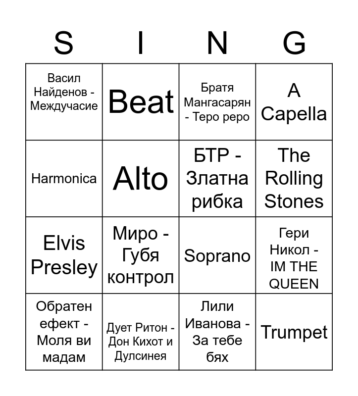 This bingo card has 31 words: Те - All right, Атлас - Кукла, Гери Никол - IM THE QUEEN, Орлин Горанов - Да започнем отначало, Васил Найденов - Междучасие, Братя Мангасарян - Теро реро, БТР - Златна рибка, Дони и Момчил - Ближи си сладоледа, Дует Ритон - Дон Кихот и Дулсинея, Ицо Хазарта - Браво, Лили Иванова - За тебе бях, Обратен ефект - Моля ви мадам, Мастило - Моите кафеви очи, Мариус Куркински - Шушу Мушу, Миро - Губя контрол, Папи Ханс – Кекс, The Beach Boys, Percussion, Trumpet, Conductor, Harmonica, Harmony, Instrument, Beat, Elvis Presley, Alto, A Capella, Soprano, Duet, The Rolling Stones and Pink Floyd.